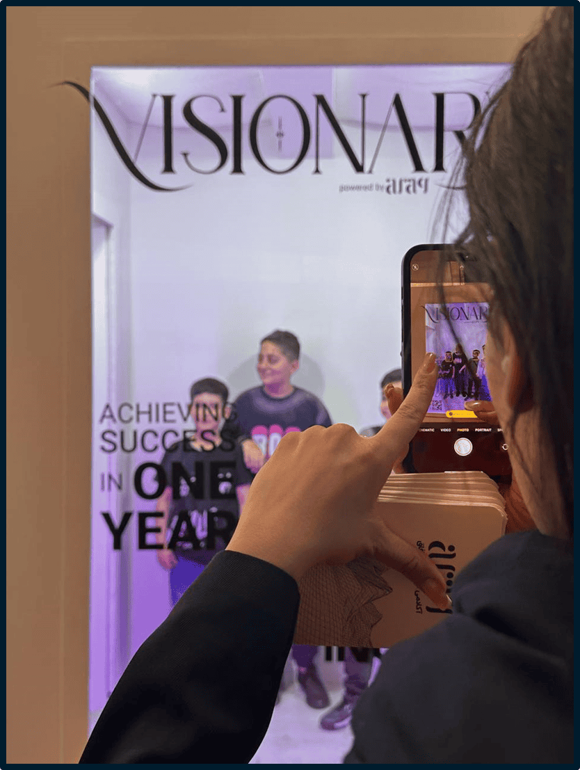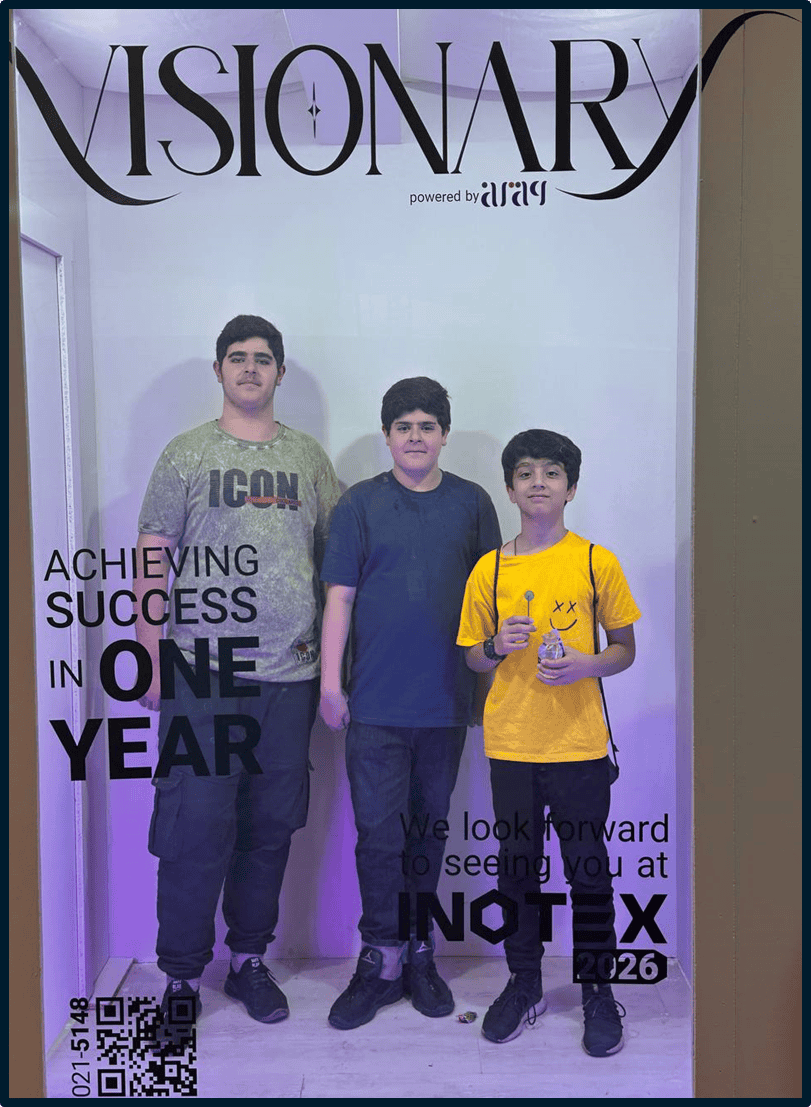 باکس عکاسی یکی از جذابترین نقاط غرفه بود. نوشتههایی روی شیشه طراحی شده بود که وقتی افراد داخل باکس میایستادند، عکسشان به شکلی ثبت میشد که انگار روی جلد یک مجله معروف هستند. این طراحی خلاقانه، در واقع معرفی غیرمستقیم دورهی یکسالهی VISIONARY بود؛ دورهای که زبان انگلیسی را از سطح مبتدی تا تسلط کامل، فقط در یک سال آموزش میدهد. هدف از این باکس، به تصویر کشیدن آیندهای بود که افراد میتوانند با تسلط بر زبان، برای خود بسازند.